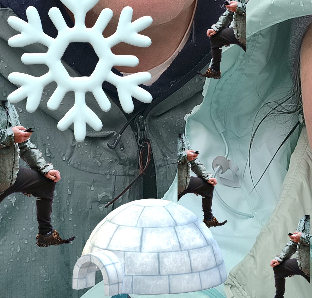 We stand in silence. I smartly have on a hat and a hood so my field of vision only includes James’ armpits and large white flakes. The snow is melting on contact and I watch it drip down his army green, therefore camouflaged, unlined raincoat. Under that he is wearing a thin vest and a cotton shirt.